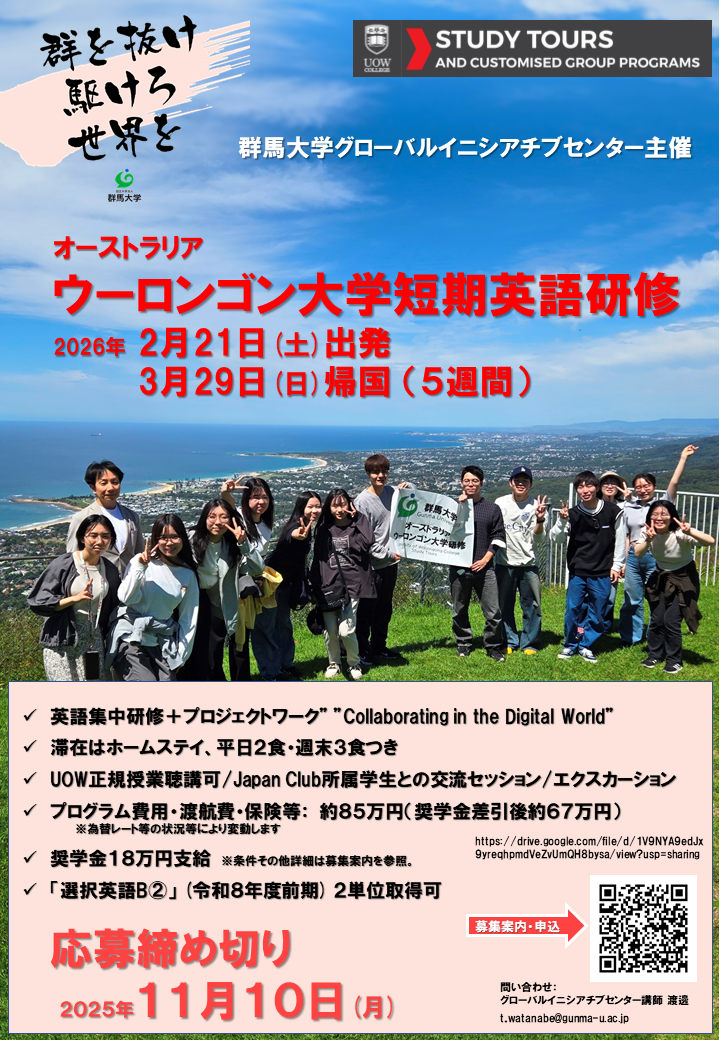 来春の「オーストラリア・ウーロンゴン大学短期英語研修」(群馬大学グローバルイニシアチブセンター主催)の参加者を募集します。
