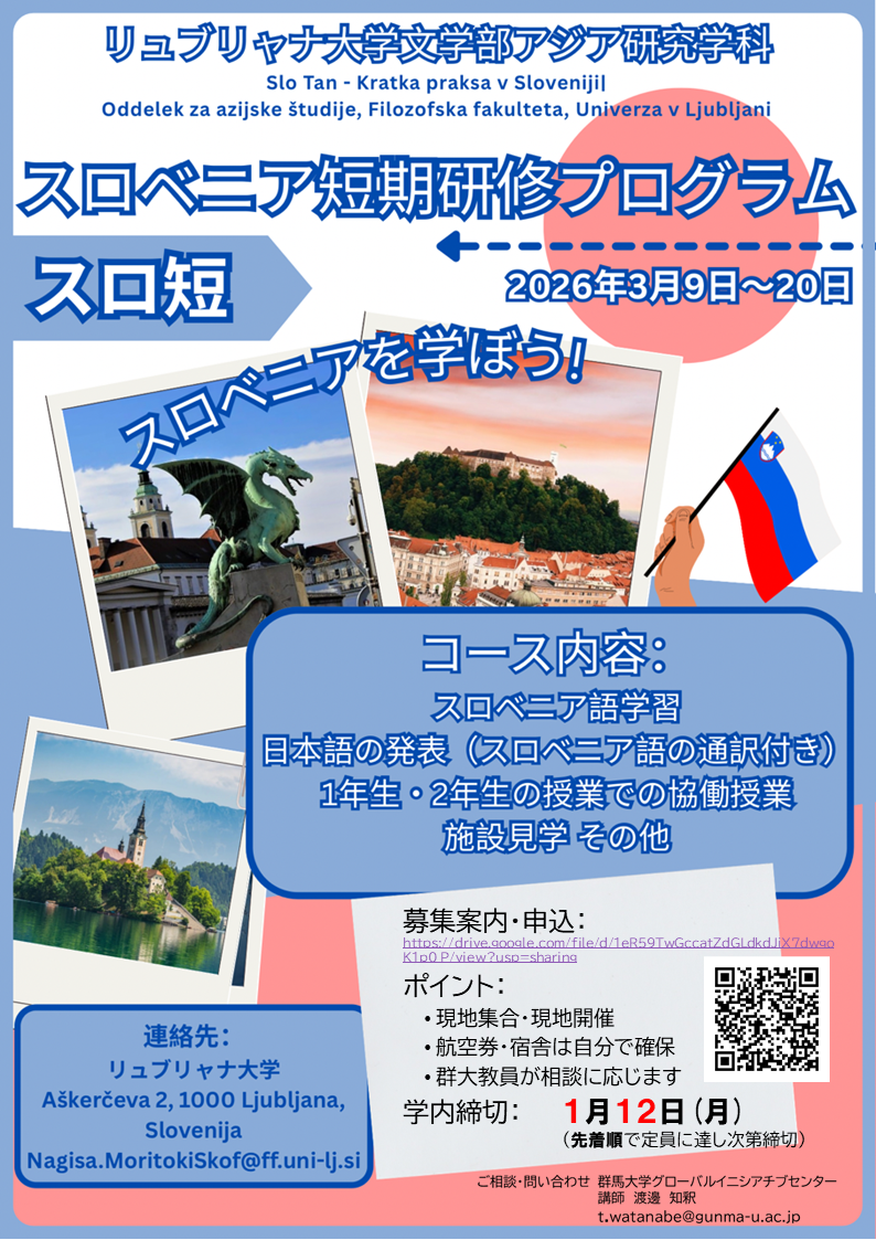 スロベニア・リュブリャナ大学主催の「スロベニア短期研修(スロ短)」の応募締切は1月12日(月)です。ご検討中の方はお急ぎください。